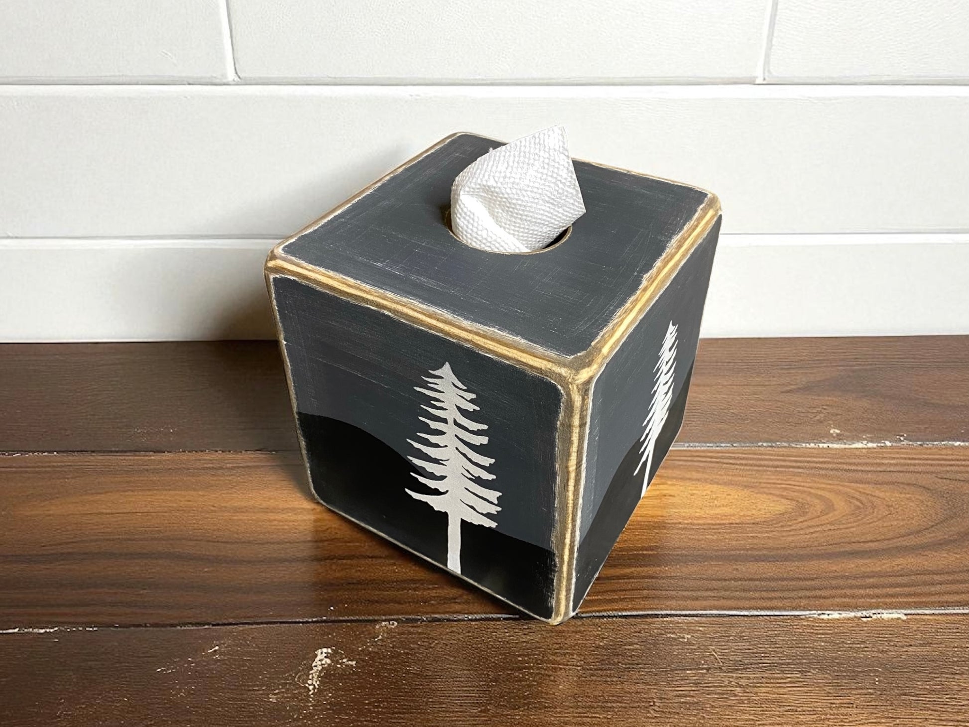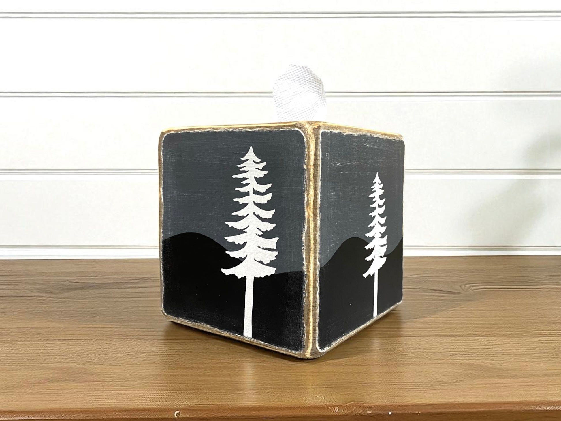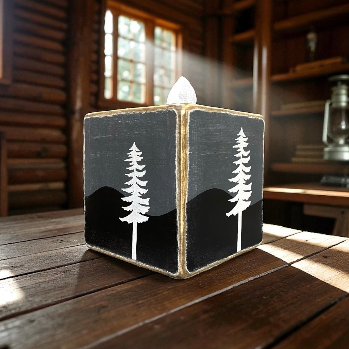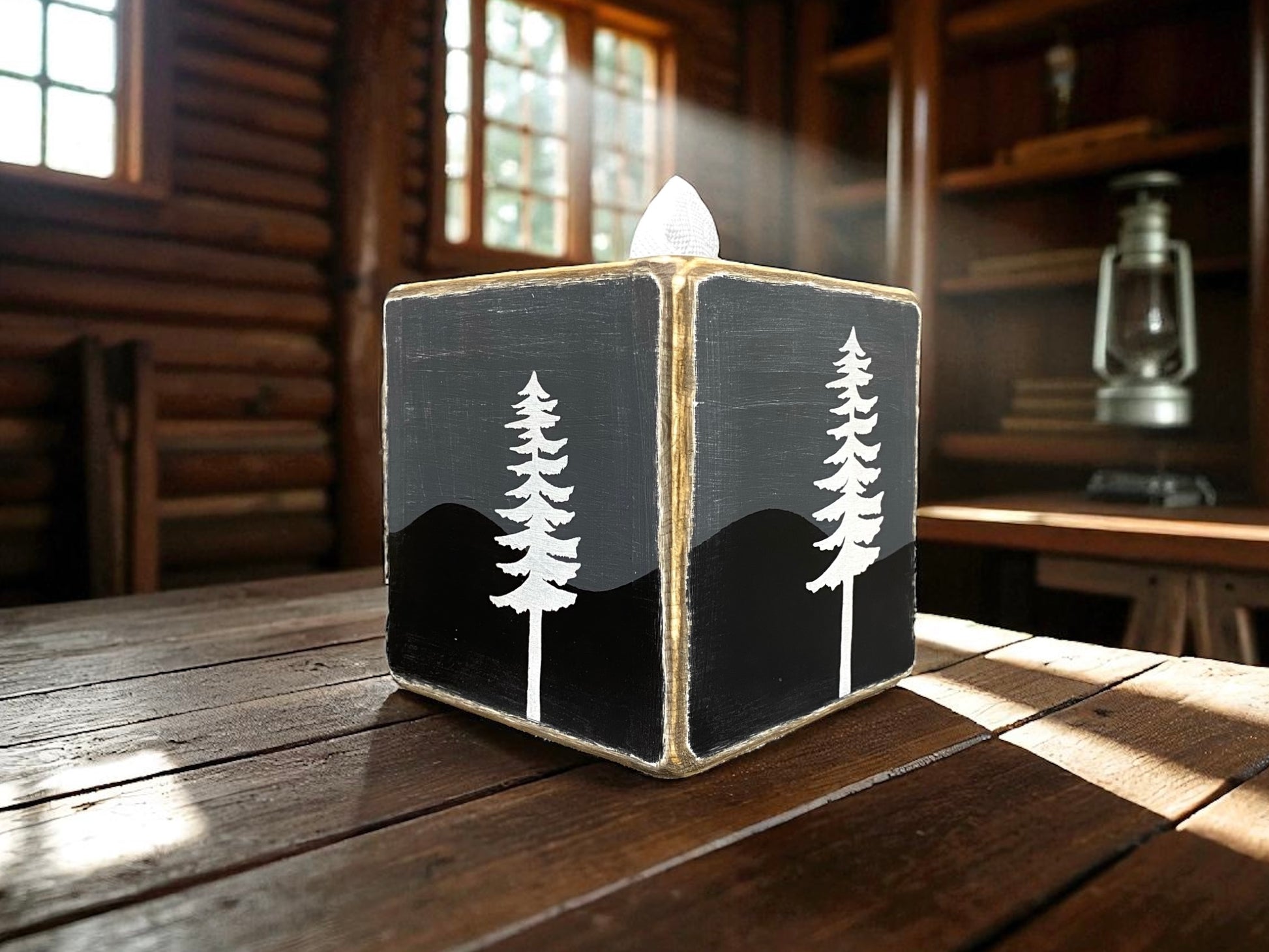 This pine tree tissue box cover is great for lake house or rustic cabin. Lightly distressed to compliment many homes!