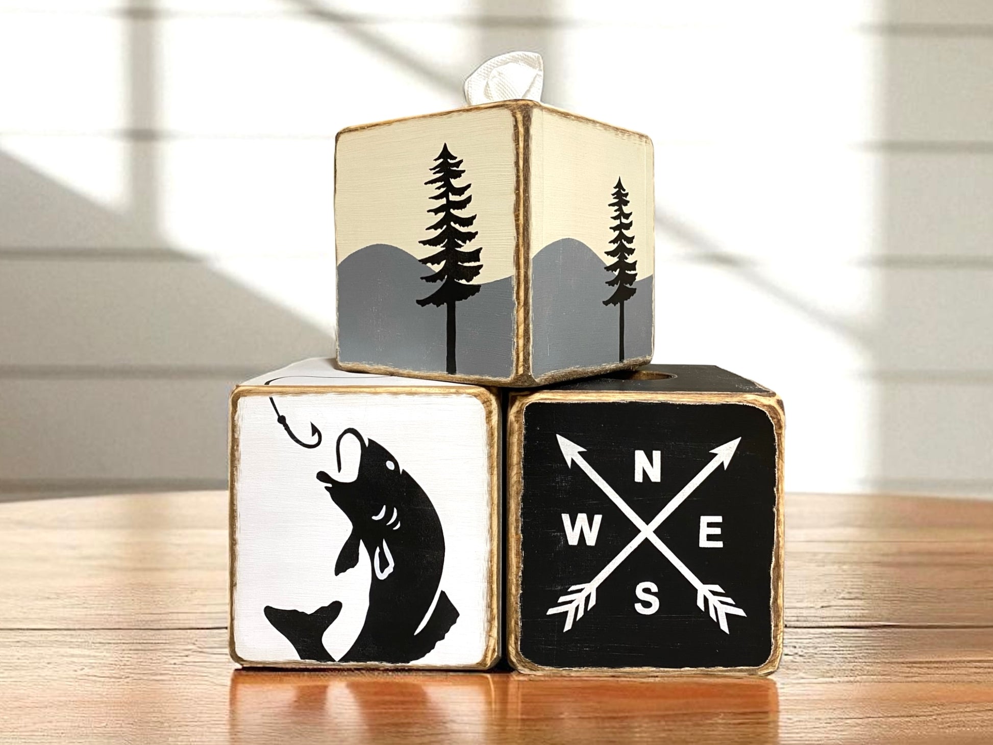 These rustic tissue boxes are perfect for mountain home or lakeside cabin! Lightly distressed and makes a great gift for hiker or fisherman.