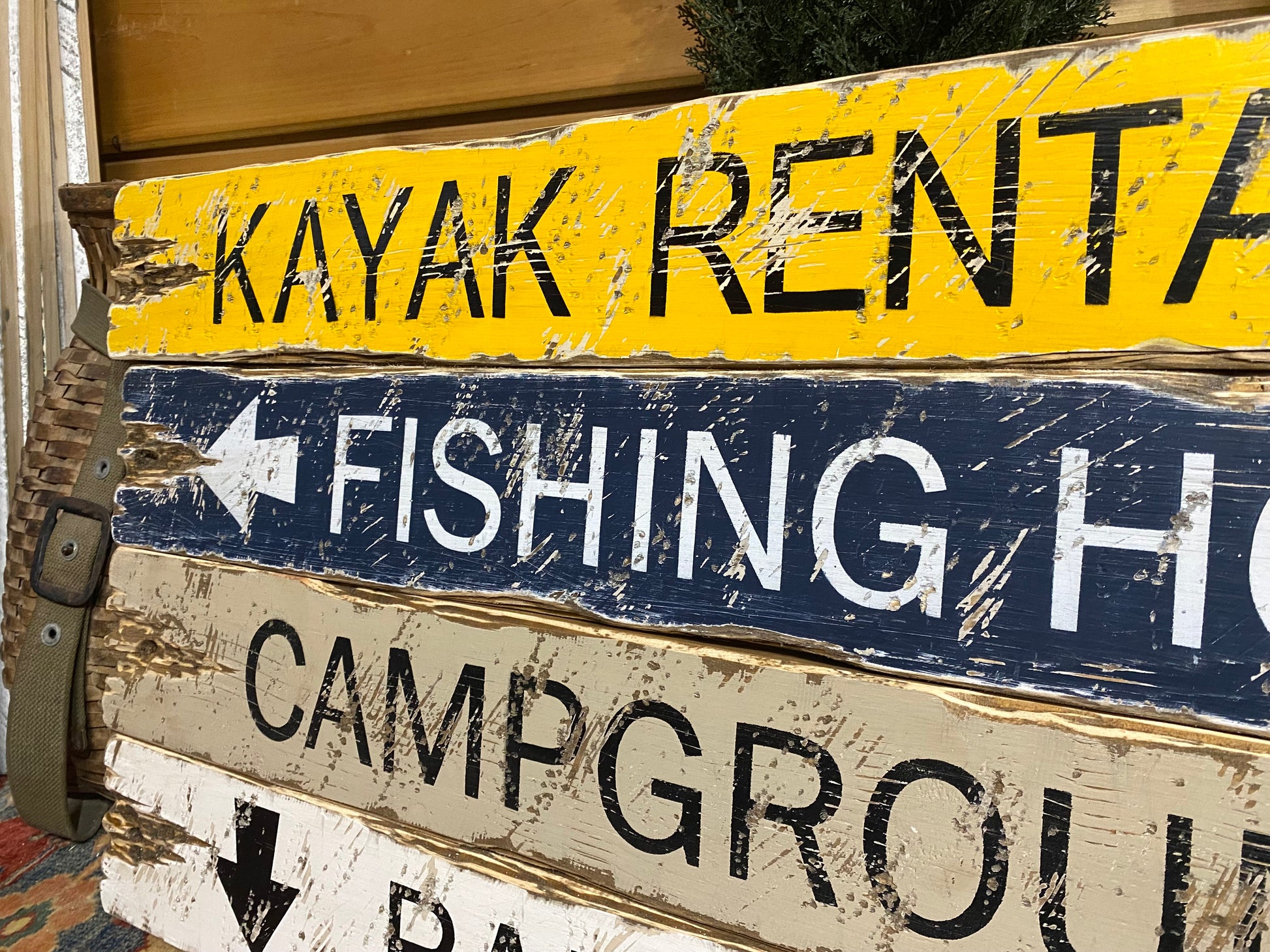 Capture the spirit of the great outdoors with this Rustic Fishing & Kayak Sign Set, a handcrafted collection of distressed wood signs perfect for your lake house, fishing cabin, or rental lodge. Designed to look like vintage trail markers, these signs bring authentic outdoor charm to any space