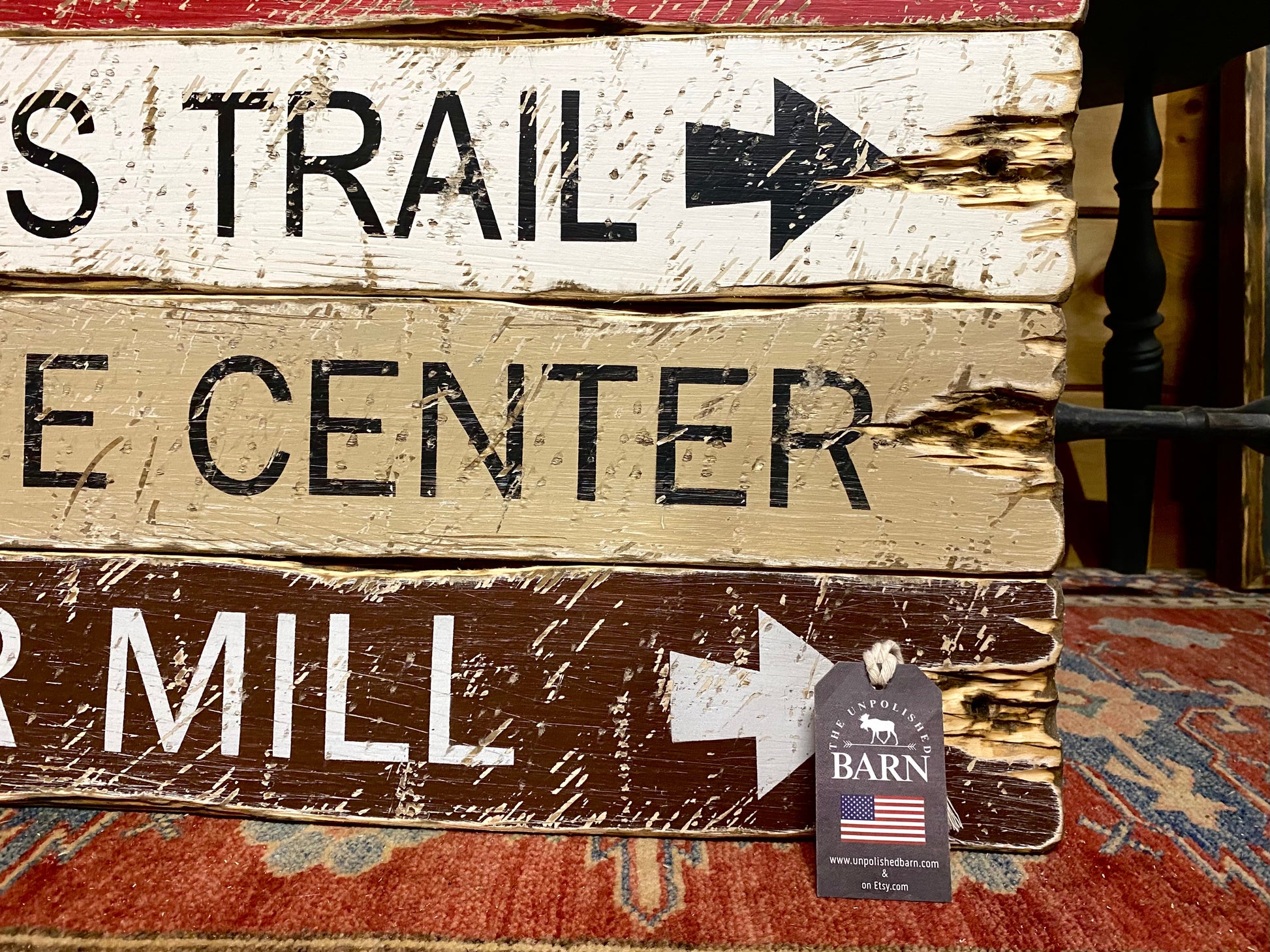Each sign is handcrafted from new wood. They are carefully distressed to create that rustic look as if the sign has been hanging outside for a lifetime.