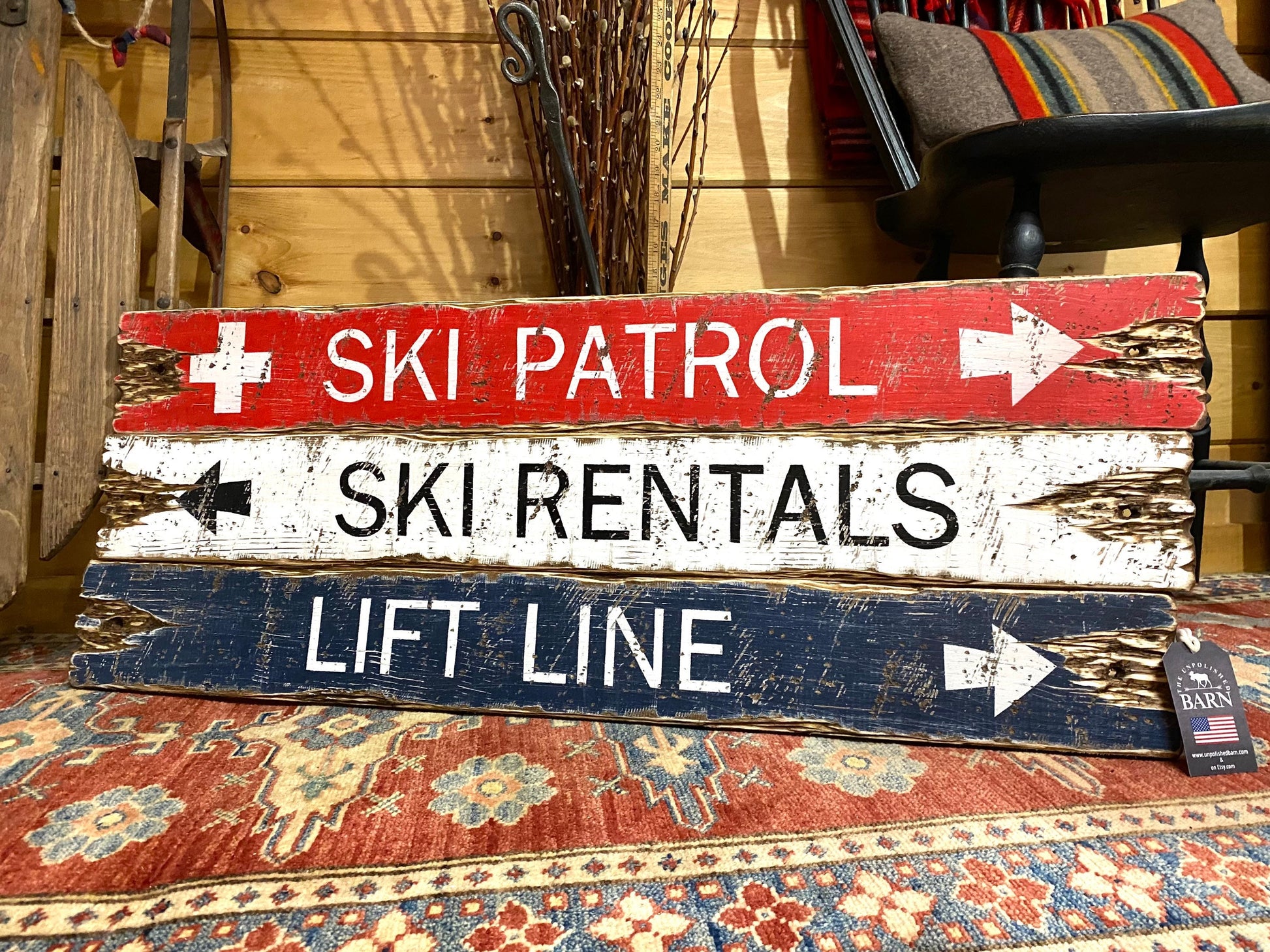 This rustic ski sign set is perfect for rustic log cabin or ski themed room! The wood is hand distressed to look like reclaimed ski trail signs!